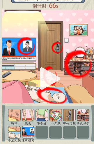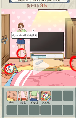 1、点击地上的脚印和小丑服,女生的腿毛,不合身的衣服。