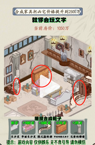就你会玩文字是十分有趣的推理解谜小游戏,玩家的任务就是找出隐藏在画面中的各种物品,完成逻辑推理,下面小编也带来了凶宅翻新的攻略,快来看看吧!就你会玩文字凶宅翻新通关攻略1、点击客厅中间合成双人皮沙发,圆桌,再合成为欧式桌子,沙发合成为华丽的~