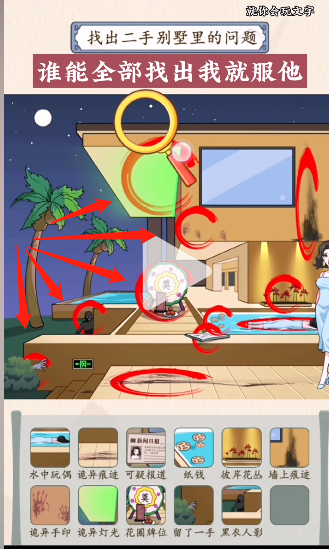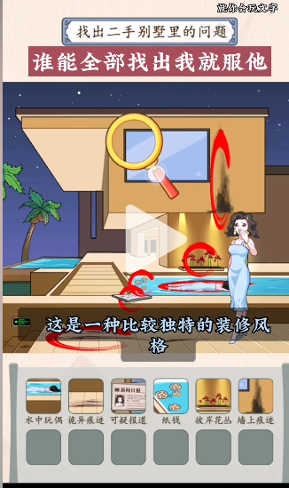 就你会玩文字玩法十分有趣,每一关都有不同的谜题等待玩家去解决,喜欢推理的小伙伴千万不要错过,下面小编也为大家带来了二手别墅这一关的答案,赶紧来看看吧!就你会玩文字二手别墅通关攻略1、找出二手别墅里的问题答案:点击水中的玩偶和纸钱,边上的报纸~