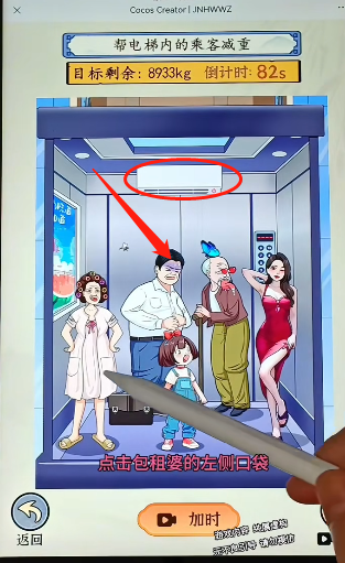 1、就你会玩文字电梯超重,需要帮电梯内的乘客减重,首先连续点击白衬衣男人的肚子