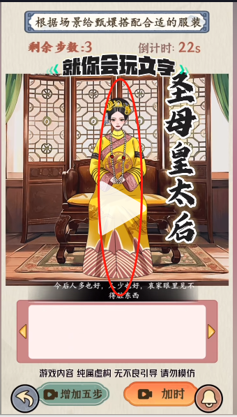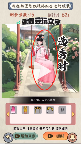 就你会玩文字是十分有趣的推理解谜小游戏,玩家的任务就是找出隐藏在画面中的各种物品,完成逻辑推理,下面小编也带来了嬛嬛的衣橱的攻略,快来看看吧!就你会玩文字嬛嬛的衣橱通关攻略1、就你会玩文字嬛嬛的衣橱,需要根据场景搭配合适的服装,首先入宫前:~