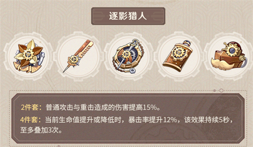 1、圣遗物建议选择逐影猎人套装,该套装二件套效果提升普攻和重击伤害。