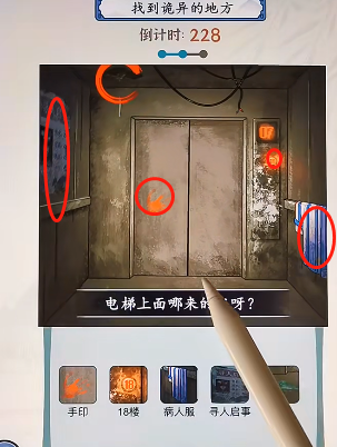 2、点击漏水的天花板,左侧的寻人启事,电梯门上的手印,18楼,右侧的衣服。