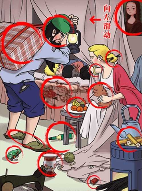 1、玩家进入游戏关卡后首先点击男人身上的蛇皮袋,还有床上的牡丹床单。