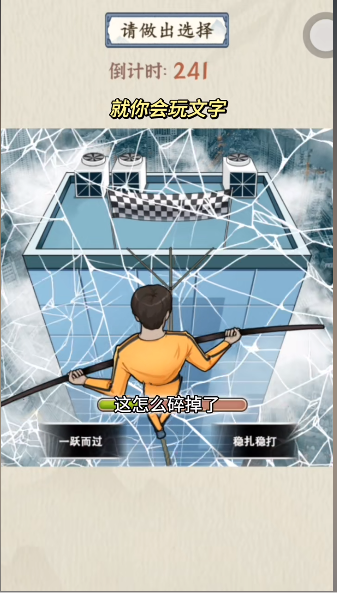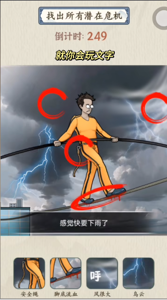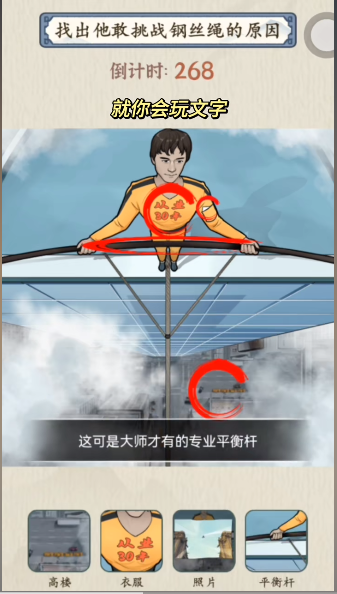就你会玩文字玩法十分有趣,每一关都有不同的谜题等待玩家去解决,喜欢推理的小伙伴千万不要错过,下面小编也为大家带来了云端漫步这一关的答案,赶紧来看看吧!就你会玩文字云端漫步通关攻略找出他敢挑战钢丝绳的原因1、点击高楼,衣服上面的字,胳膊上衣服~