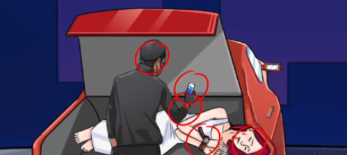 2、点击掉落的手机、昏迷的女孩、捆住女孩手的绳子、凶手手上的液体、凶手手腕的伤、面罩。