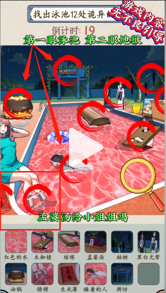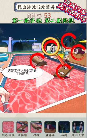 1、就你会玩文字泳池派对答案:点击泳池的水,带着木质枷锁的人,棺椁右边的孟婆汤,边上的枯树和黑白无常。