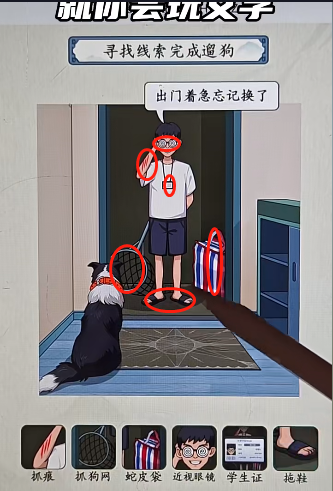 1、点击胳膊上的抓痕,手里的抓狗网,地上的蛇皮袋,脚上的拖鞋,脖子上的学生证,眼镜,不交。
