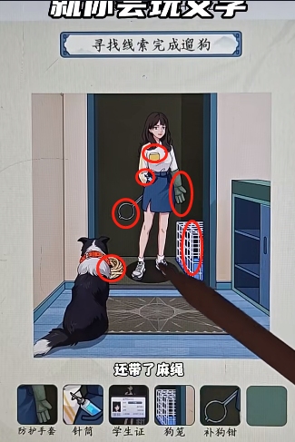 2、点击手上的防护手套,捕狗钳,地上的麻绳,笼子,兜里面的学生证和针筒,将狗交给她。