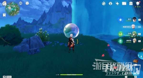 浮出水面后,旁边的草地上有个水球,进入水球。