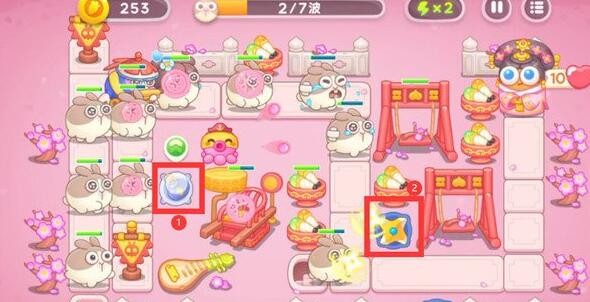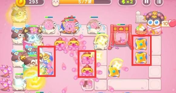 1、第一步在左边中间的空地处放置章鱼炮台并升级到最高级,这个很关键因为前期的小怪和路障都需要他来清除,第二步,在右下角设置风扇炮台,开局这样摆放足够清理第一波