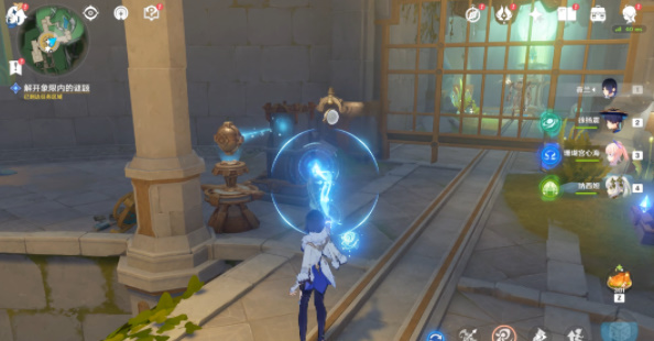 3、然后跟随指引获取能力将图中左边柱子调到最低,右边降低即可开门。