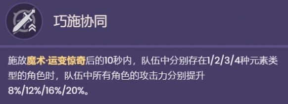 释放魔术运变惊奇,可以提高队伍的攻击力里,持续时间是10秒,元素种类越多,攻击力越高。