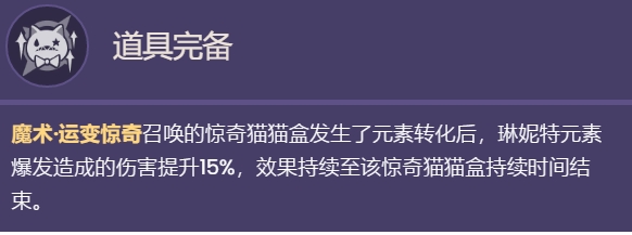 通过魔术运变惊奇可以召唤猫猫盒,琳妮特的元素发生转变,角色的元素爆发伤害可提高15%。