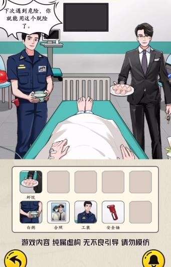3、选择左边工装男子,点击手上的粥,裤兜里的锤子,身后椅子上的安全帽盖住的房产证,以及上衣口袋里的两人合照;