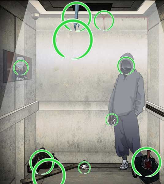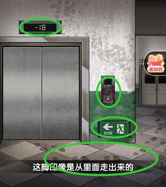 1、玩家进入游戏关卡后可以看到电梯的楼层在-18层,查看按钮上面会发现有红色的血迹。